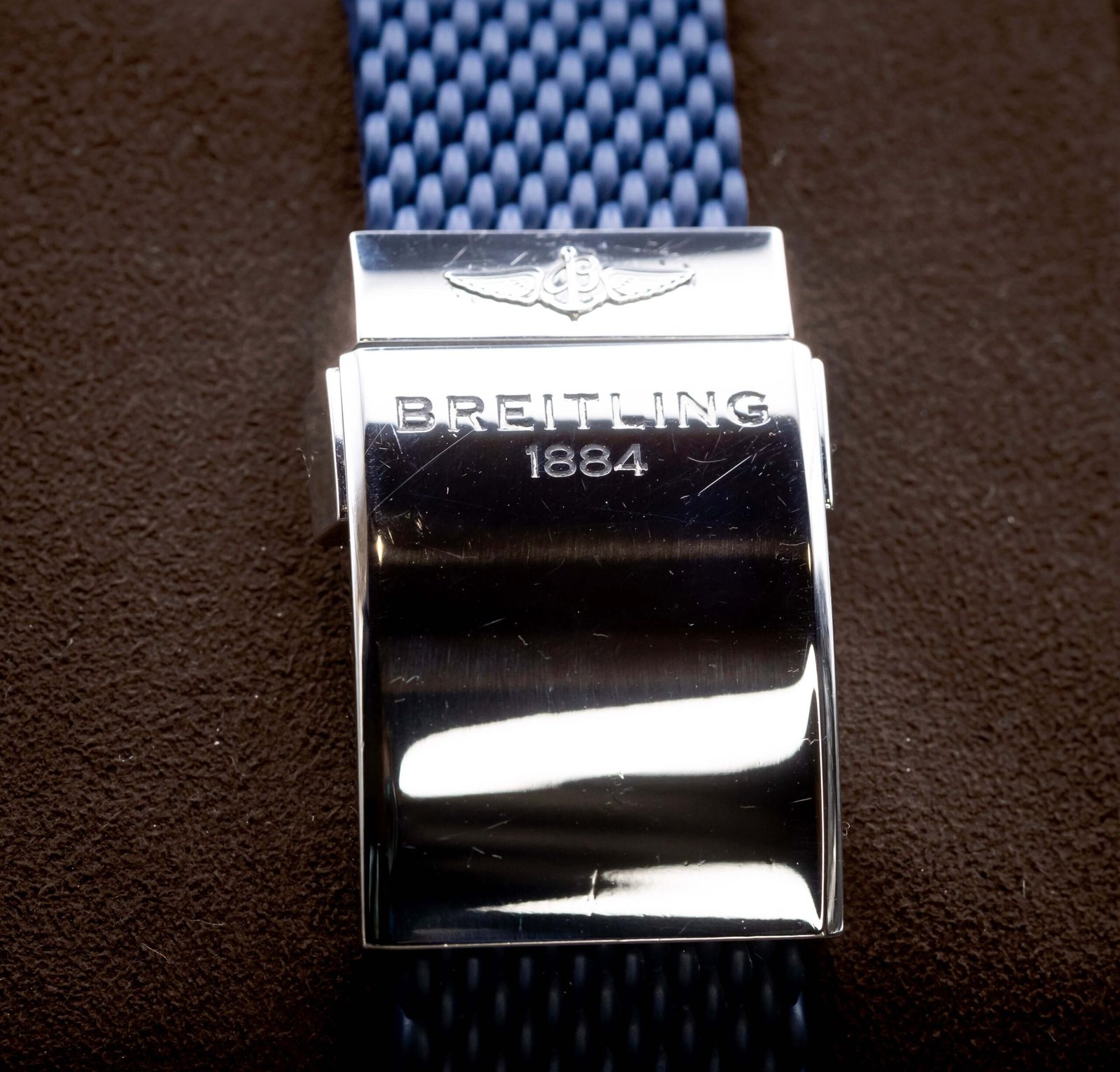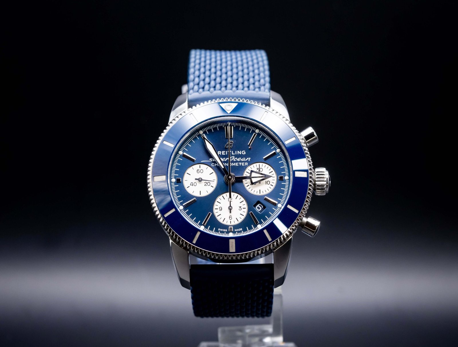 The striking deep blue dial is complemented by luminous markers and hands for excellent readability, while the chronograph subdials add both function and visual balance. Paired with a durable blue rubber strap, this configuration emphasizes the Superocean’s sport-focused character while remaining refined enough for everyday wear.