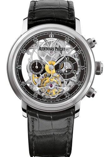 41 mm 18K white gold case, 13.3 mm thick, glareproofed sapphire crystal back, glareproofed sapphire crystal, satin-brushed black openworked dial with black counters and white gold hands, Calibre 2936 hand-wound movement with tourbillon, chronograph, hours, minutes, small seconds, approximately 72 hours of power reserve, hand-stitched large square scale black alligator strap, 18K white gold AP folding buckle. Water resistant to 20 meters.