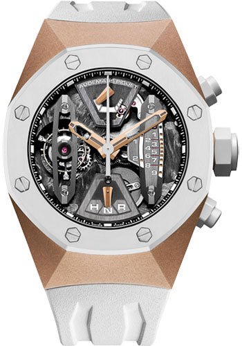 44 mm 18K pink gold case, 16.1 mm thick, glareproofed sapphire crystal back, white ceramic pushpieces and screw-locked crown, white ceramic bezel, glareproofed sapphire crystal, the mainplate of the movement acts as the dial with white indications, pink gold hands, black inner bezel, Manufacture 2941 hand-wound movement with tourbillon, linear chronograph minute counter with central sweep seconds hand, power reserve indicator, selection indicator, hours, minutes, approximately 237 hours of power reserve, white rubber strap, 18K pink gold AP folding buckle. Water resistant to 100 meters.