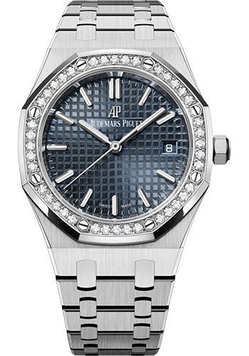 34 mm stainless steel case, 8.8 mm thick, glareproofed sapphire crystal back, bezel set with 40 brilliant-cut diamonds (~0.71 carats), glareproofed sapphire crystal, blue-grey dial with Grande Tapisserie pattern, white gold applied hour-markers and Royal Oak hands with luminescent coating, Calibre 5800 selfwinding movement with hours, minutes, centre seconds and date, approximately 50 hours of power reserve, stainless steel bracelet, AP folding buckle. Water resistant to 50 m.