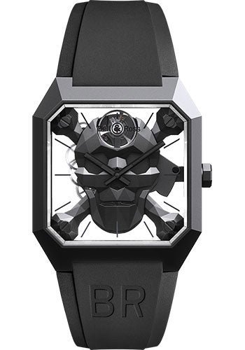 45 mm x 46.5 mm matt black ceramic case, sapphire crystal with anti-reflective coating, skeletonised dial with black ceramic skull, calibre BR-CAL.208 hand-wound movement with hours and minutes, moving skull when wound by hand, black rubber strap, pin buckle.