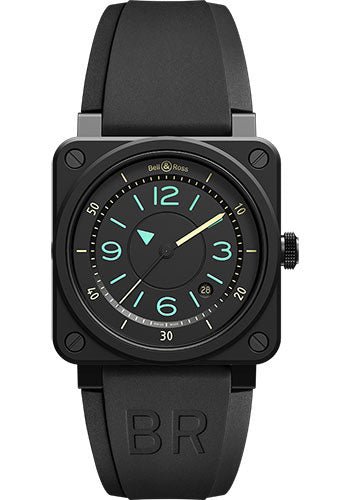 42 mm matt black ceramic case, sapphire crystal with anti-reflective coating, matt black dial with central hour disc with super-luminova marking, calibre BR-CAL.302 automatic movement with hours, minutes, seconds and date, black rubber and ultra-resilient black synthetic fabric strap, black PVD coated steel pin buckle. Water resistant to 100 metres.