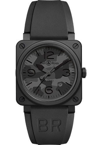 42 mm matte black ceramic case, sapphire crystal with antireflective coating, dial with upper insert with black and grey camouflage pattern, cut away around the hour markers, revealing the black superluminova that covers the lower insert, self-winding movement with hours, minutes, seconds and date, black rubber and ultra-resilient black synthetic fabric strap, black PVD coated steel pin buckle.