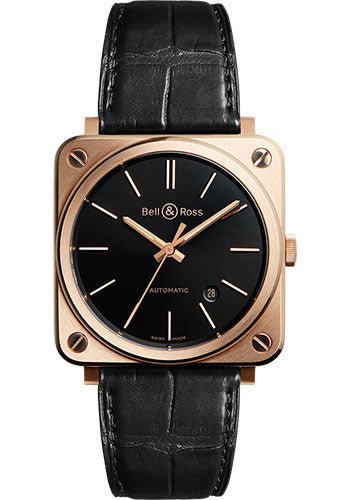 39 mm polished, satin-finished 18K rose gold case, sapphire crystal with anti-reflective coating, black dial with gilt appliquŽ hour markers, calibre BR-CAL.302 automatic movement with hours, minutes, seconds and date, black alligator strap, 18 ct rose gold pin buckle.