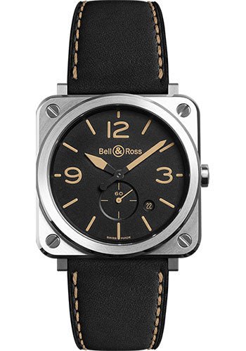 39 mm steel case with satin-polished, sapphire crystal with anti-reflective coating, black dial with sand-coloured superluminova-filled numerals, indices and hour and minute hands, calibre br-cal.102 quartz movement with hours, minutes, small seconds at 6 o’clock, black calfskin strap, satin-polished steel pin buckle. Water resistant to 100 meters.