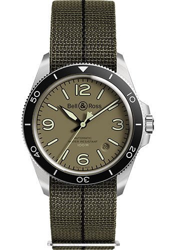 41 mm satin-polished steel case, sapphire back, screw-down crown, bi-directional rotating steel bezel with anodized black aluminum ring and 60-minute scale, box-type sapphire crystal crystal with anti-reflective coating, khaki dial with green super-luminova numerals and indices, calibre BR-CAL.302 automatic movement with hours, minutes, central seconds and date, khaki and black elastic canvas strap. Water resistant to 100 metres.