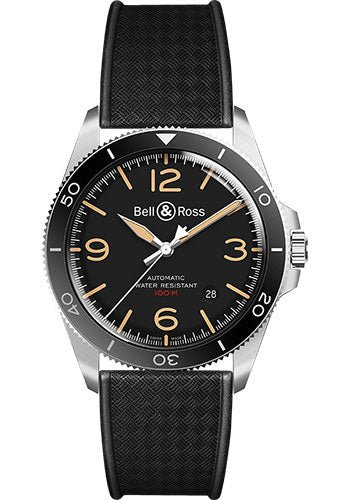 41 mm satin-polished steel case, sapphire back, screwdown crown, rotating steel bezel with anodized black aluminum ring and 60-minute scale, ultra-curved sapphire crystal with anti-reflective coating, black dial with sand Superluminova hour markers, calibre BR-CAL.302 automatic movement with hours, minutes, central seconds, date, black rubber strap, steel pin buckle. Water resistant to 100 meters.