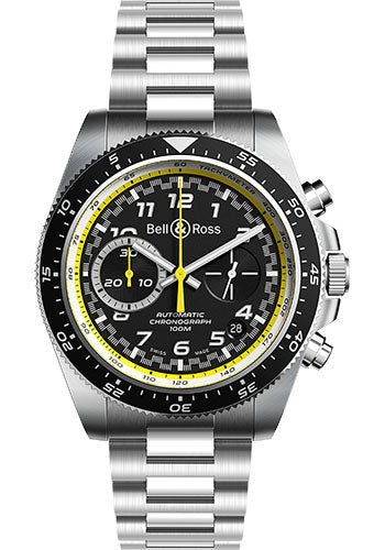 43 mm satin-polished steel case, sapphire back, screw-down crown, bi-directional rotating steel bezel with anodised black aluminium ring with countdown timer, curved sapphire crystal crystal with anti-reflective coating, matt black dial with applique super-luminova-filled numerals, calibre BR-CAL.301 automatic movement with hours, minutes, small seconds at 3 o’clock and date, chronograph, satin-polished steel bracelet, folding buckle. Water resistant to 100 metres.