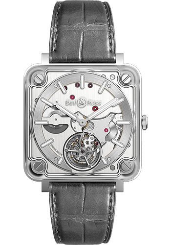 42.5 mm satin-polished steel case, sapphire crystal with anti-reflective coating, skeletonised dial with metal applique Superluminova-filled indices, calibre BR-CAL.380 automatic movement with hours and minutes, flying tourbillon at 6 o’clock, grey alligator strap, steel folding buckle. Water resistant to 50 metres.