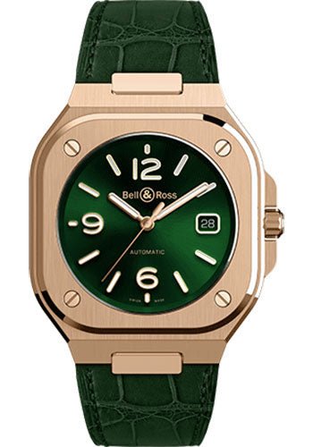 40 mm, 10,33 in thick, 18 k rose gold and sapphire back with 18 k rose gold plated 360¡ oscillating weight, screw-down crown, sapphire crystal with anti-reflective coating, green sunray dial with rose gold gilded applique numerals and indices filled with super-luminova, calibre BR-CAL.321 automatic movement with hours, minutes, seconds and date, green alligator skin strap, folding buckle. Water resistant to 100 metres.