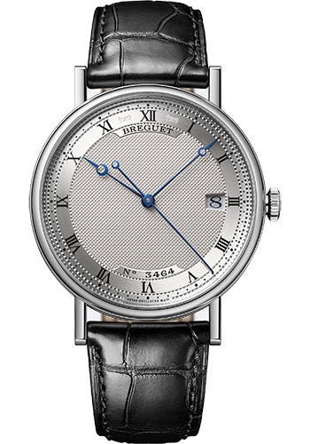 38 mm 18K white gold case, 8.8mm thick, sapphire crystal back, silvered gold dial, caliber 777Q self-winding movement, approximately 45 hours of power reserve, black leather strap. Water resistant to 30 meters.