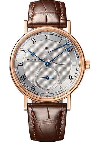 38 mm 18K rose gold case, 8mm thick, sapphire crystal back, silvered gold dial with seconds subdial and 96-hour power-reserve indicator, caliber 515DR hand-winding movement, approximately 96 hours of power reserve, brown leather strap. Water resistant to 30 meters.