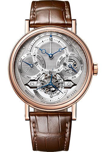 41mm 18K rose gold case, 11.6mm thick, sapphire crystal back, welded end pieces, silvered and multi-patterened engine-turned dial with Roman numerals hours chapter on a sapphire disc, Breguet open-tipped hands in blued steel. Retrograde dates indication at 12 o’clock, days at 9 o’clock, and months and leap years at 3 o’clock, Small seconds on the tourbillon axis, caliber 558QP2 hand-winding movement, approximately 50 hours of power reserve, brown leather strap, triple-blade folding buckle. Water resistant to 30 meters.