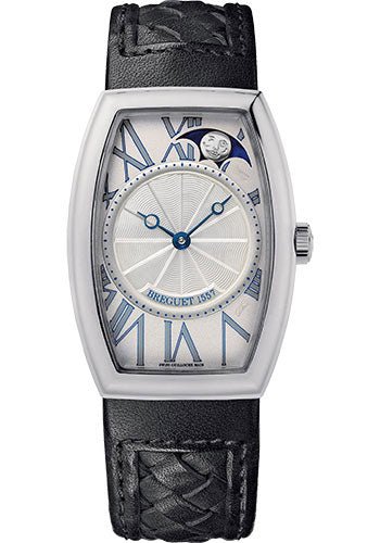 35 x 25 mm 18K white gold case, 9.75mm thick, cambered frosted silvered and natural mother-of-pearl dial, caliber 586L self-winding movement with retrograde moon-phase indicator, approximately 36 hours of power reserve, black leather strap. Water resistant to 30 meters.