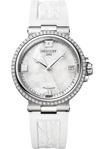 33.80 mm steel case, 9.89 mm thick, sapphire back, set with diamonds bezel, mother-of-pearl dial, calibre 591A self-winding movement, approximately 38 hours of power reserve, white rubber strap. Water resistant to 50 meters.