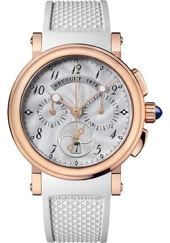 34.6mm 18K rose gold case, 12.30mm thick, transparent back, 18K rose gold bezel, scratch resistant sapphire crystal, silver dial with a fine sunburst wave pattern, caliber 550 self-winding movement with small seconds hand and date at 6 oÕclock, approximately 45 hours of power reserve, white rubber strap with 18K gold marine folding clasp with two gold loops, deployant buckle. Water resistant to 50 m (150ft).