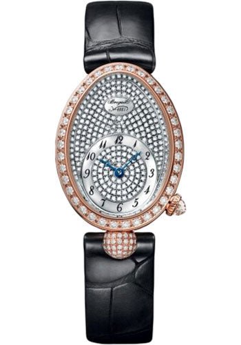 24.95 mm rose gold case, 8.50 mm thick, sapphire back, set with a briolette diamond crown, diamond paved dial, calibre 586/1 self-winding movement, approximately 38 hours of power reserve, black leather strap. Water resistant to 30 meters.