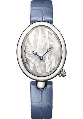 32.7 x 27.3mm stainless steel case, sapphire crystal back, grained natural white mother-of-pearl dial, caliber 586/1 self-winding movement, approximately 38 hours of power reserve, lavendar leather strap. Water resistant to 30 meters.