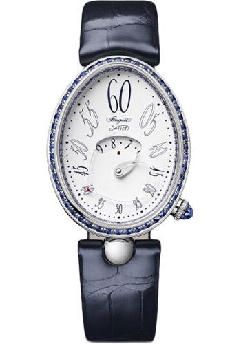 28.45 mm white gold case, 11 mm thick, sapphire back, set with a blue sapphire crown, set with blue sapphires bezel, white lacquered dial with Breguet Arabic numerals, calibre 78A0 self-winding movement, approximately 40 hours of power reserve, blue alligator strap. Water resistant to 30 meters.