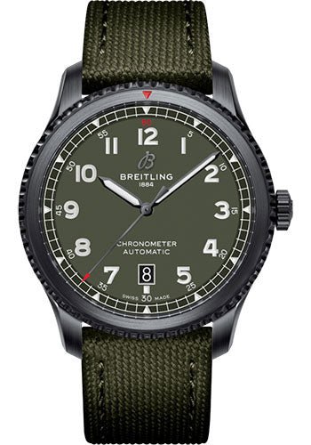 Breitling Aviator 8 Automatic 41 Black Steel Curtiss Warhawk Watch – Black steel – Green Dial – Green Kaki Leather Strap – Tang Buckle – M173152A1L1X1