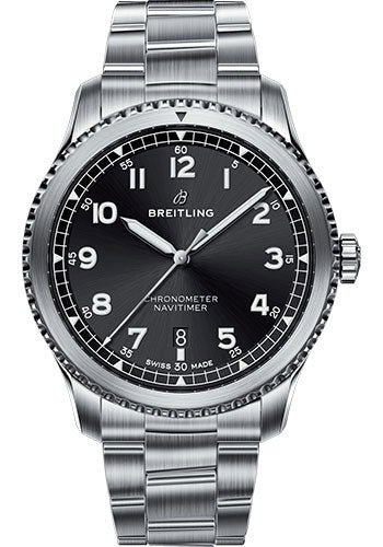 41.00 mm steel case, 10.74 mm thick, screw-locked crown with two gaskets, bidirectional bezel, cambered sapphire crystal with glareproof treatment on both sides, black dial, Breitling 17 self-winding movement with date in dial aperture, approximately 38 hours of power reserve, steel and satin Professional III bracelet. Water resistant to 100 m (330 ft).