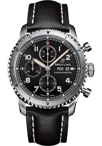 43.00 mm stainless steel case, 14.17 mm thick, screw-locked crown with two gaskets, bidirectional bezel, cambered sapphire crystal with glareproof treatment on both sides, black dial, Breitling 13 self-winding movement, approximately approx. 48 hrs of power reserve, black calfskin leather strap, tang buckle. Water resistant to 100 m (330 ft).