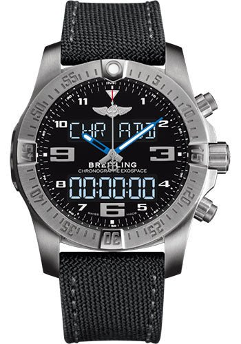 46.00 mm titanium case, 15.25 mm thick, non screw-locked crown with two gaskets and integrated pushpiece, bidirectional ratcheted bezel, sapphire crystal with glareproof treatment on both sides, volcano black dial, Breitling B55 (Manufacture) SuperQuartz movement, black military strap, tang buckle. Water resistant to 100 m (330 ft).