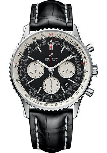 43.00 mm steel case, 14.22 mm thick, sapphire crystal back, non screw-locked crown with two gaskets, bidirectional bezel with slide rule, cambered sapphire crystal with glareproof treatment on both sides, black dial, Breitling 01 self-winding movement with date in dial aperture and chronograph function, approximately 70 hours of power reserve, black croco strap, tang buckle. Water resistant to 3 bars.