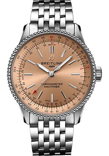 35.00 mm stainless steel case, 9.92 mm thick, non screw-locked crown with two gaskets, bidirectional slide rule bezel, cambered sapphire crystal with glareproof treatment on both sides, copper dial, Breitling 17 self-winding movement, approximately approx. 38 hrs of power reserve, metal bracelet. Water resistant to 3 bars.