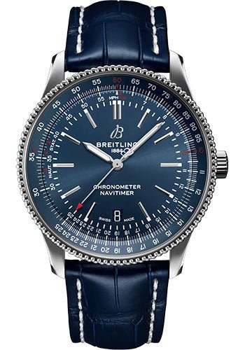 41.0 mm stainless steel case, 10.0 mm thick, non screw-locked crown with two gaskets, blue dial, Breitling 17 self-winding movement, approximately approx. 38 hrs of power reserve, blue alligator leather strap, tang buckle. Water resistant to 3 bars.
