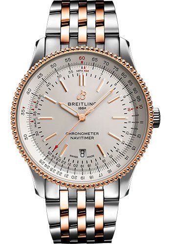 41.00 mm stainless steel and 18K red gold case, 10.00 mm thick, non screw-locked crown with two gaskets, bidirectional slide rule bezel, cambered sapphire crystal with glareproof treatment on both sides, silver dial, Breitling 17 self-winding movement, approximately approx. 38 hrs of power reserve, metal bracelet. Water resistant to 3 bars.