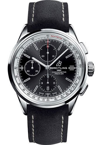 42.00 mm stainless steel case, 13.80 mm thick, non screw-locked crown with two gaskets, cambered sapphire crystal with glareproof treatment on both sides, black dial, Breitling 13 self-winding movement, approximately 48 hours of power reserve, anthracite nubuck strap, folding buckle. Water resistant to 100 m (330 ft).