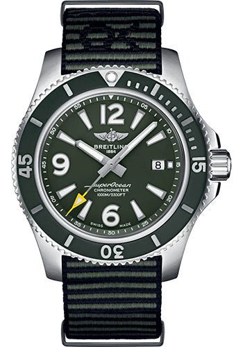 44.00 mm stainless steel case, 14.20 mm thick, screw-locked crown with two gaskets, cambered sapphire crystal with glareproof treatment on both sides, green dial, Breitling 17 self-winding movement, approximately approx. 38 hrs of power reserve, khaki green econyl® yarn strap, tang buckle.