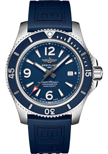 44.00 mm stainless steel case, 14.20 mm thick, screw-locked crown with two gaskets, unidirectional ratcheted bezel, cambered sapphire crystal with glareproof treatment on both sides, blue dial, Breitling 17 self-winding movement, approximately approx. 38 hrs of power reserve, blue rubber strap, pushbutton folding buckle. Water resistant to 1,000 m (3,300 ft).