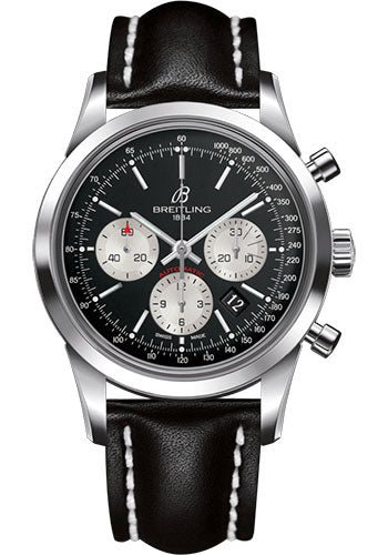 43.00 mm steel case, 14.35 mm thick, transparent sapphire crystal back, non screw-locked crown with two gaskets, convex sapphire crystal with glareproof treatment on both sides, black dial, Breitling 01 (Manufacture) self-winding movement, approximately 70 hrs of power reserve, black leather strap, folding buckle. Water resistant to 100 m (330 ft).