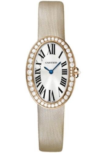 Small (31.6mm x 24.5mm) 18K pink gold case set with round diamonds, silvered dial with sun-like finish, quartz Cartier calibre 057 movement, fabric strap with 18K gold ardillon buckle. Water resistant to 30 meters.
