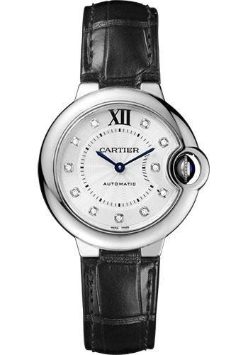 33mm stainless steel case, 9.96mm thick, fluted crown set with a synthetic cabochon-shaped spinel, sapphire crystal, silvered dial with sunburst effect set with 11 brilliant cut diamonds totaling 0.05 carats, self-winding movement, black alligator strap, double adjustable folding buckle. Water resistant to 30 meters. W4BB0009.