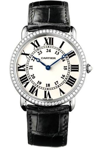 Large size, 18K white gold case set with diamonds, silver dial, manual winding mechanical movement, alligator strap with 18K gold deployant buckle. Water resistant to 30 meters (100 feet).