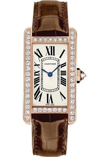 34.8mm x 19mm 18K pink gold case with brilliant cut diamonds, 7.34mm thick, 9-sided crown with a diamond, sapphire crystal, silvered dial with blued-steel sword-shaped hands, quartz movement, brown alligator skin strap, 18K pink gold double adjustable folding buckle. Water resistant to 30 meters.