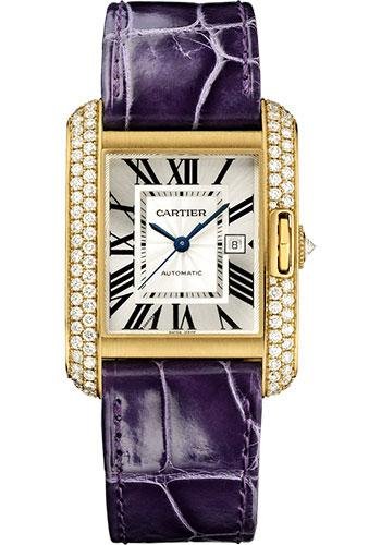 39.2mm x 29.8mm 18K yellow gold case set with diamonds, 9.5mm thick, nine sided crown with a cut diamond, sapphire crystal, silvered dial with blued steel hands, caliber Cartier 077 automatic movement, aubergine alligator strap, double adjustable deployant buckle with 18K yellow gold. Water resistant to 30 meters.