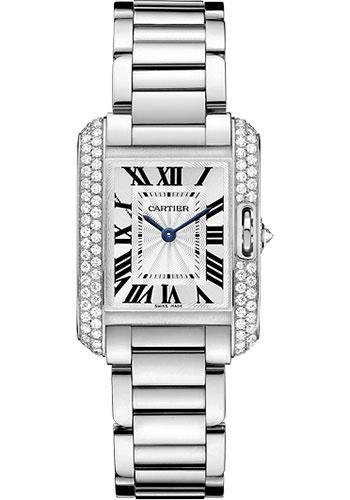 Small size (30.2mm x 22.7mm) rhodiumized 18K white gold case set with brilliant-cut diamonds, nine-sided crown set with a brilliant-cut diamond, sapphire crystal, slivered and lacquered flinque dial with Roman numerals and sword-shaped blued-steel hands, quartz caliber Cartier 057 movement, rhodiumized 18K white gold bracelet. Water resistant to 30 meters.
