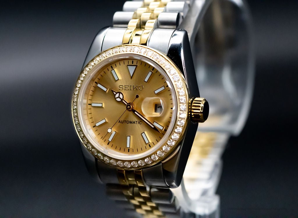 The Champagne DJ Seikomod is a premium addition to our exclusive collection at Custom Seiko Mods. Crafted with meticulous precision, this unique timepiece features a classic champagne dial adorned with shimmering diamond markers, seamlessly blending luxury and functionality. At NMAWatchGuy, we pride ourselves on creating one-of-a-kind, personalized watches that reflect your individual style.