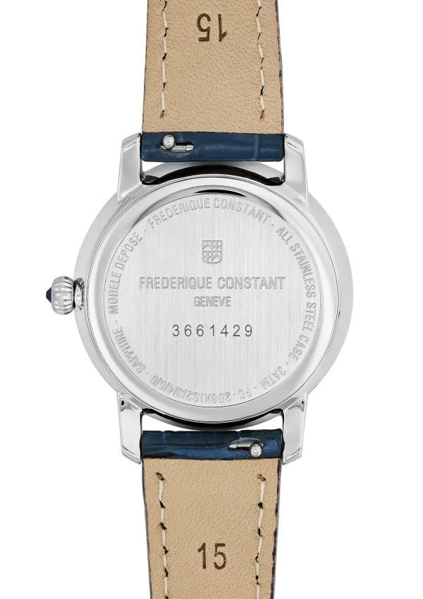 The Classics Slimline Ladies Moonphase watch is designed to emphasise the delicate curves of the wearer’s wrist in a tender, balanced way with its 30mm case. This refined model features a moon phase on the mother-of-pearl dial. This precious, contemporary collection encapsulates the expertise and craftsmanship of Frederique Constant, offering luxury Swiss watches that are affordable and provide a touch of celestial poetry.
