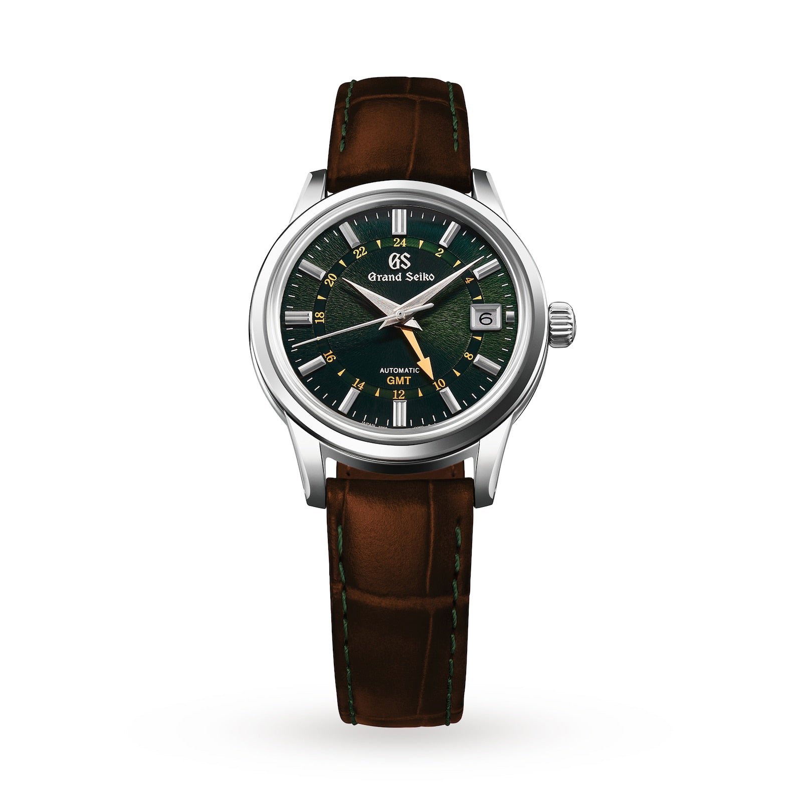 The exterior case design is an original creation by acclaimed Grand Seiko Chief Designer, Nobuhiro Kosugi, who is celebrated for his conception of the modern 44GS case design. It features a crescent moon-shaped profile courtesy of the Zaratsu polished, curved lugs. A royal gold GMT hand adds a distinctive touch and the brown leather strap, with fine green stitching, beautifully finishes the bold, refined and minimalistic aesthetic.