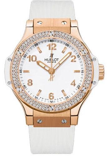38mm 18K red gold case, 18K red gold bezel set with 126 diamonds, white dial, quartz movement, white rubber strap with deployant buckle. Water resistant to 100 meters.