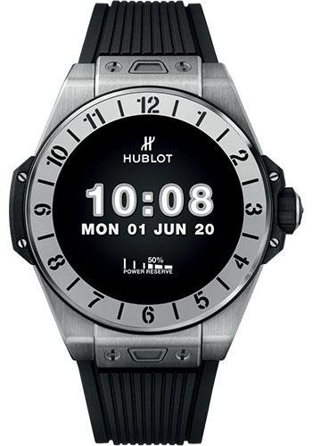 42 mm satin-finished and polished titanium case, satin-finished and polished titanium bezel, sapphire crystal with anti-reflective treatment, digital hublot watchfaces dial, Qualcomm® movement, approximately around 1 day of power reserve, black structured lined rubber strap, titanium deployant buckle. Water resistant to 30m (3 ATM).