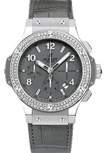 41mm satin-polished steel case, stainless steel bezel set with 114 diamonds, tantalum color dial, self winding HUB 1145 movement with chronograph function, approximately 42 hours of power reserve, grey rubber-alligator strap with deployant buckle. Water resistant to 100 meters.