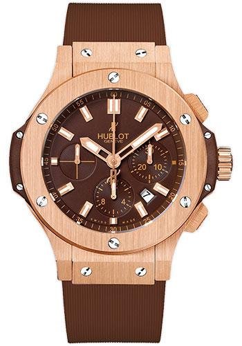 44mm 18K red gold case, 18K red gold bezel, chocolate composite resin lateral inserts and bezel lugs, chocolate dial, self winding HUB 4100 movement with chronograph function, approximately 42 hours of power reserve, chocolate rubber strap with deployant buckle. Water resistant to 100 meters.