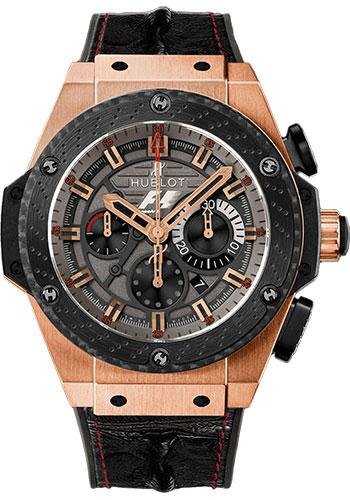 48mm 18K satin-finished King gold case, brake disc designed black ceramic bezel, black composite resin lateral inserts and bezel lugs, multi-layered black and grey dial with basketball decoration, self winding HUB 4100 movement with chronograph function, approximately 42 hours of power reserve, red stitched black rubber and hornback crocodile leather strap with 18K King gold and black PVD titanium deployant buckle. Water resistant to 100 meters.
