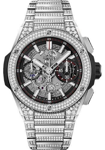 42 mm satin-finished and polished titanium case set with 120 diamonds, satin-finished and polished titanium bezel set with 138 diamonds, 6 H-shaped titanium screws, black composite resin lower bezel, sapphire crystal with anti-reflective treatment, matte black skeleton dial, HUB1280 UNICO manufacture self-winding chronograph flyback movement, approximately 72 hours of power reserve, satin-finished and polished titanium bracelet, titanium deployant buckle. Water resistant to 100m (10 ATM).